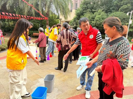 活动现场设置三大功能区,互动氛围热烈。在国庆氛围立牌打卡区,居民们早早排起长队,手持小国旗、面带笑容在立牌前合影,定格“家国同庆”的温馨瞬间;垃圾分类服务咨询区里,“月饼盒属于哪类垃圾”等常见问题不断被提出,志愿者耐心解答并发放《生活垃圾分类指导手册》,确保居民“听得懂、用得上”;游园互动区则推出“垃圾分类投卡片”“套圈”“大转盘”等实操游戏,居民凭集章卡通关兑换礼品,在“玩中学”中巩固垃圾分类习惯。