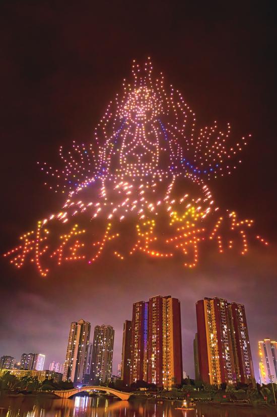 新渝报讯(记者犹骥)10月1日晚,大足区香国公园妙善湖上空化作一幅流动的星河画卷——作为《一念·大足》昌州夜宴国庆中秋主题活动的重头戏,无人机编队以苍穹为卷,为全区群众和游客开启了一场穿越千年的对话,生动诠释了世界文化遗产的深厚底蕴。夜幕降临,无人机群如灵动的画师,在夜空中勾勒出世界文化遗产大足石刻的壮丽图景。巨型佛像在光影变幻中渐次舒展,细腻线条与柔和光晕交织,瞬间将观众带入千年石刻的庄严与神秘。随后佛像幻化为“大足印”图腾,寓意“千里之行,始于足下”,恰与国庆佳节的热烈氛围交相辉映。表演高潮迭起,无人机群化身宝顶山卧佛,31.6米长的卧佛横亘天际,气势恢宏;转而化作龙水湖蜿蜒的湖岸线,山水相依的灵秀在烟花中跃然眼前。更令人惊叹的是,一条巨龙盘旋攀升,拱卫起流光溢彩的“天空之门”,冷烟花如星雨倾泻,将中华文明的图腾与现代科技完美融合。