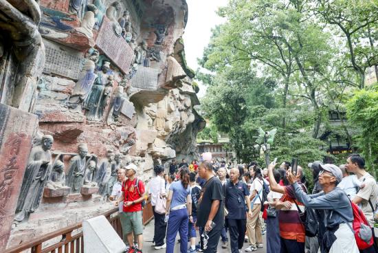 新渝报讯(记者李东陈柯男特约通讯员曾蕊)国庆中秋双节期间,大足石刻景区客流攀升,以“中国红”为底色的节日氛围与特色文旅活动交织,让游客在触摸千年石刻魅力的同时,沉浸式感受家国情怀。