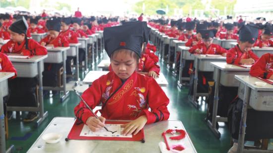 新渝报讯(记者余佳熊敏秀)额点朱砂启智慧,手描人字学做人。9月29日,大足区龙岗第一小学621名一年级新生,在庄重的传统开蒙礼中,迎来了小学生涯的第一课。这是该校连续第十年为新生举办这项传统启蒙活动。