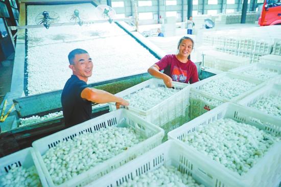 近日,在黔江高新区一丝绸公司,工人转运烘烤的蚕茧。近年来,黔江区根据季节和桑园所在地的不同海拔,全年分7批次养蚕。时下,第一批次秋蚕结茧结束,蚕农们抓紧采摘蚕茧、交售。当地丝绸公司则抓紧收购,并及时烘烤和入库。 武陵都市报记者杨敏摄