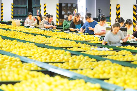 近日,潼南区雪王农业有限公司车间内,工人在包装柠檬鲜果。 作为重庆百亿级柠檬产业集群的核心区,潼南已构建起集育苗、种植、研发、加工、物流、销售于一体的完整产业链,种植面积达32万亩,建成标准化果园100余个。 受气候影响,今年国内各大主要柠檬产区鲜果产量较往年下降。潼南依托完善的柠檬产业链以及相关大型企业的技术优势、产能优势、资源优势,通过“企业+产业链”协同联动,有效平抑市场价格波动,增强了产业抗风险能力,助力果农稳产增收。重庆日报记者张春晓摄