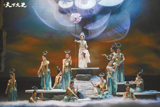 舞剧《天下大足》由中国东方演艺集团有限公司、中共重庆市委宣传部、中共重庆市大足区委、重庆市大足区人民政府、人民网股份有限公司共同出品,中国东方演艺集团舞蹈演员张翰、孟庆旸、朱瑾慧、何仲达担纲主演,以舞蹈艺术演绎大足石刻文化,用100分钟的时长浓缩讲述大足石刻400余年的开凿史。该剧把大足石刻雕刻工匠作为主角,让演员高度还原大足石刻吹笛女、媚态观音等经典造像,以浓墨重彩的篇章描绘人间烟火气,生动呈现大足石刻的世俗化、生活化的特点。今年上半年,该剧在全国12城巡演37场,主创团队边演边改,于9月份集中力量完成较大幅度的调整,推出升级版,并于10月18日、19日在四川省宜宾市参加文华奖终评。