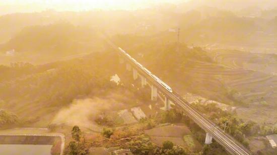 11月4日清晨,位于大足区邮亭镇的成渝高铁大足南站被缥缈的平流雾笼罩,列车缓缓驶出站台后加速,车身划破薄雾留下流畅弧线,快速行驶的高铁与静谧的晨雾、远山、农田动静呼应,勾勒出一幅流动的山水田园画卷。 据了解,作为我国“八纵八横”高铁网沿江通道的重要组成部分——成渝中线高铁也将于2027年开通,届时,大足将形成“一南一北”双高铁枢纽格局,大幅提升文旅出行便捷度。