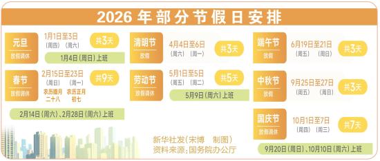 其中,2026年春节假期创造“史上最长”:2月15日(农历腊月二十八、周日)至23日(农历正月初七、周一)放假调休,共9天。2月14日(周六)、2月28日(周六)上班。