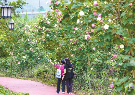 11月5日,大足区棠香街道和平村,成片芙蓉花如云霞般竞相盛开,粉白交织的花海沿环河步道铺展,成为秋日乡村里一道靓丽的风景线,引得市民游客纷纷驻足打卡。