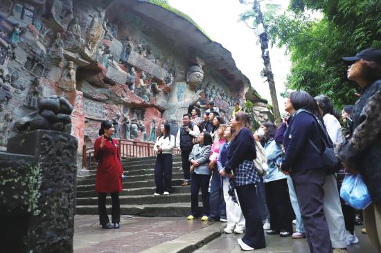 这里是大足 11月9日,游客参观大足石刻宝顶山景区。今年以来,随着大足石刻登上央视春晚、舞剧《天下大足》在全国进行首轮巡演、“昌州夜宴”等新的文旅项目接连推出,大足旅游热度持续攀升,前三季度大足接待游客3588万人次、旅游总收入231亿元,分别同比增长19.7%、33.1%。 新渝报记者邓小强摄