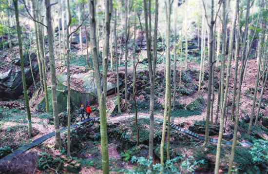 11月11日,大足区高坪镇巴蜀雅楠景区内,游客沿着蜿蜒的石板小径漫步于茂密的金丝楠木林间,感受这片百年林海特有的静谧与清幽。 巴蜀雅楠景区地处重庆大足与四川安岳交界处,这里的楠木树龄多在百年以上,总数达5万余株,树干笔直挺拔,与林间奇石相映成趣,构成独特的自然景观。目前,景区已打造“楠木听禅”“巴蜀之心”等特色景点10余处,凭借珍稀的生态资源和丰富的景观层次,成为集观光探险、森林康养、休闲度假于一体的冬游胜地。 新渝报记者黄舒摄